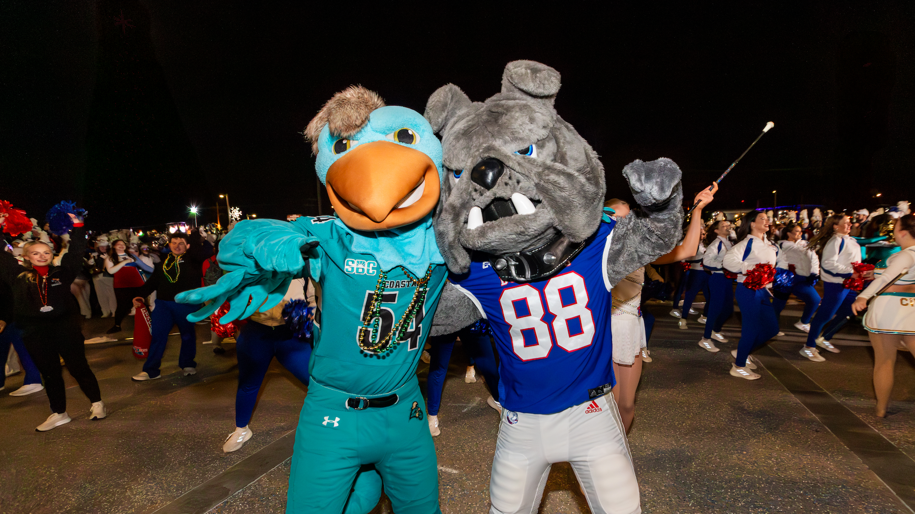 Right after the Mardi Gras Preview Parade, the two university marching bands and spirit squads go back and forth in a Battle of the Bands in the East Bank District Plaza! Local fans and fans of both schools gather right around the bands and cheer on their squads!
