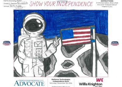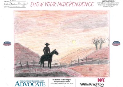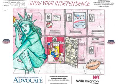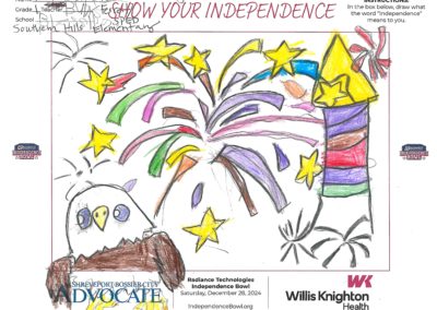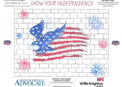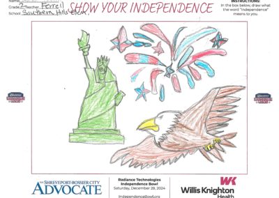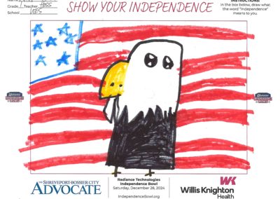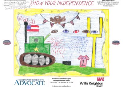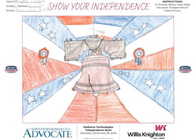 The Independence Bowl started the “Show Your Independence” Art Contest 11 years ago, which asks local elementary school kids to draw what the word “Independence” means to them. Winners are selected from each grade level at each school and given two tickets to the game, and their artwork is put on display at Independence Stadium during the game.